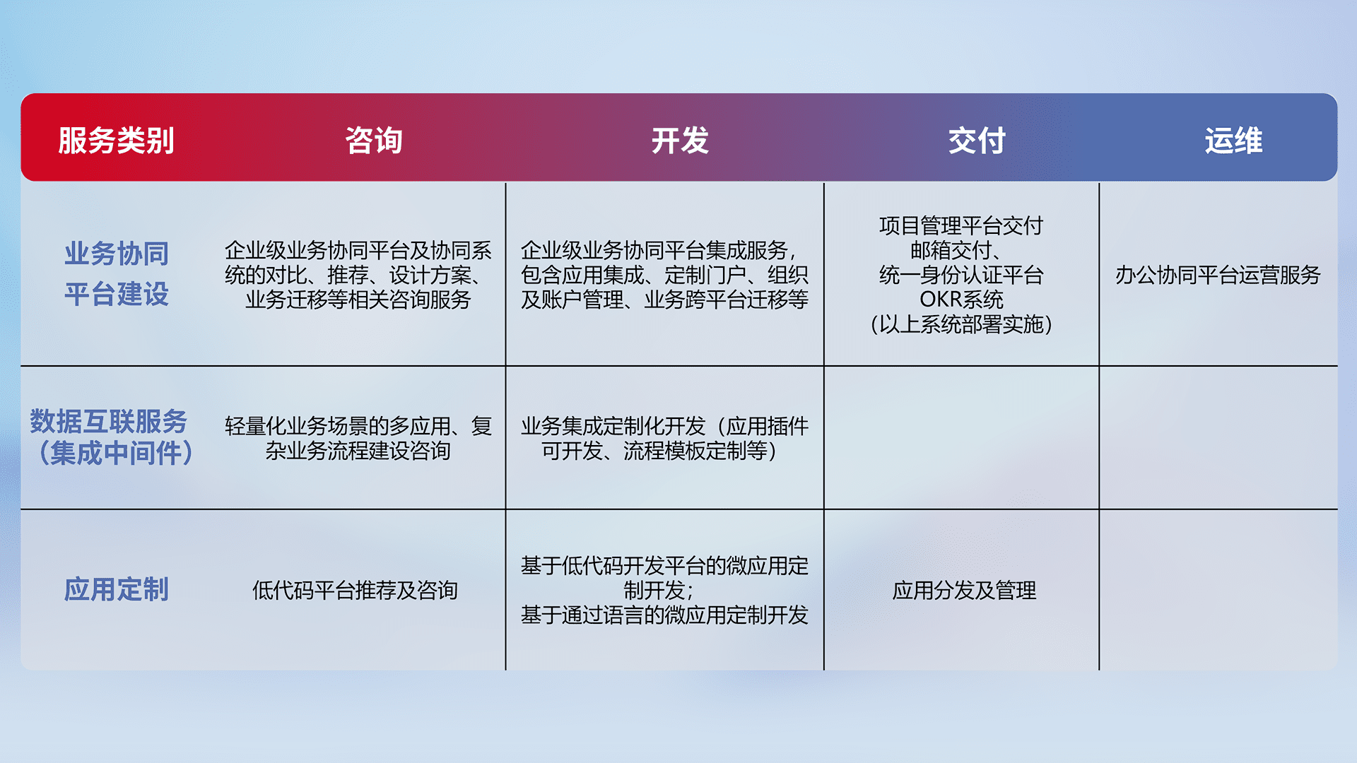 针对钉钉、、、、企微、、IDaas等平台级产品提供产品的规划、、方案、、、、交付、、、、定制化开发等服务,,,,实现如统一协同办公、、、智能客户服务、、、、混合会议管理、、智能数据查询、、、、等业务场景,,实现数字化转型。。。